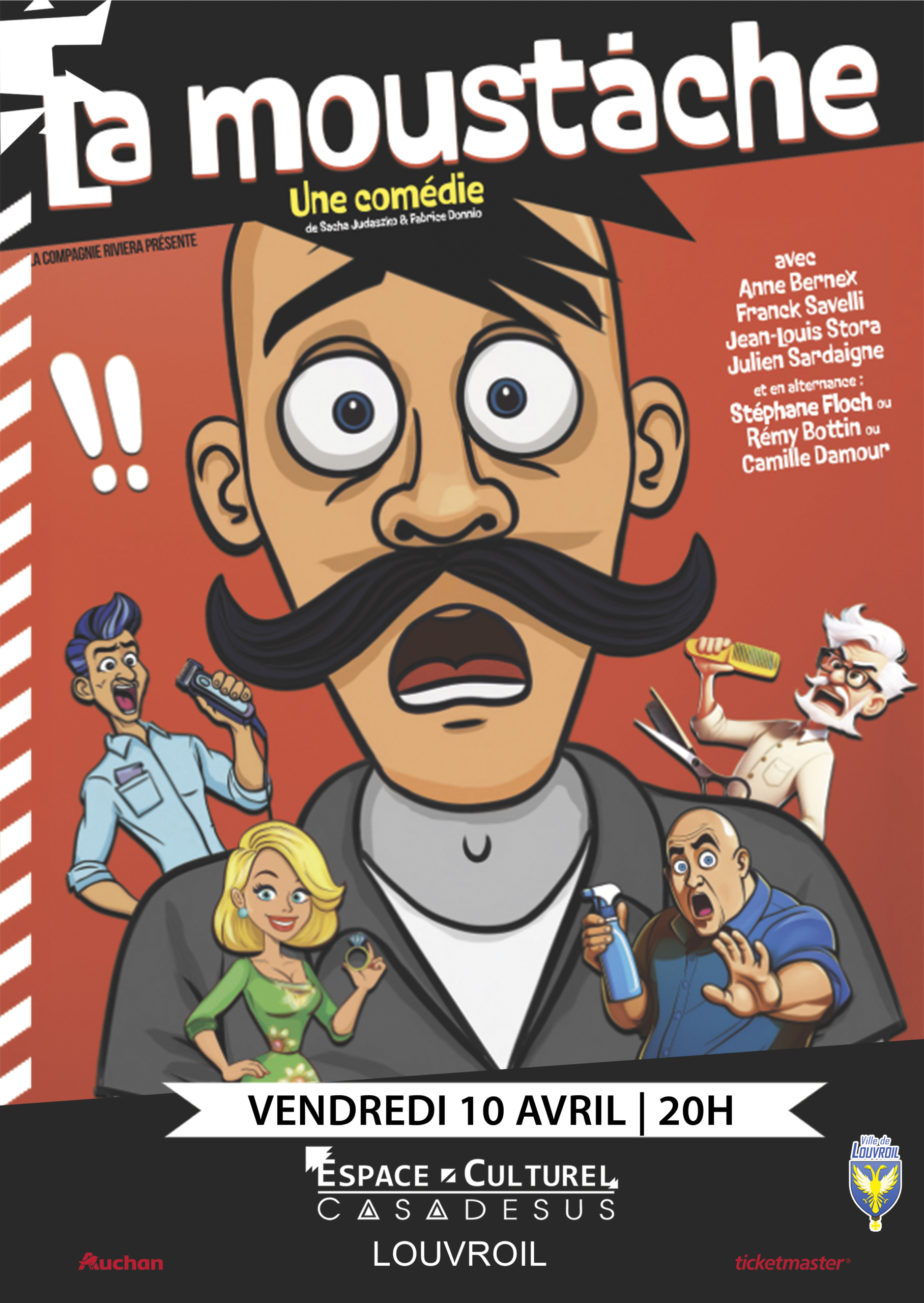 Aujourd’hui est un jour décisif pour Sylvain Sabourdin : il doit rencontrer son futur beau-père, passer un entretien d’embauche crucial, et prendre des décisions importantes pour son avenir. Mais alors qu’il se prépare, une panne d’électricité l’empêche de se raser complètement… le laissant affublé d’une moustache improbable ! Ce petit incident va déclencher une avalanche de quiproquos aussi inattendus qu’hilarants. Créée en 2018 au théâtre de la Gaîté Montparnasse, dans une mise en scène de Jean-Luc Moreau, La Moustache s’impose comme l’une des comédies les plus réussies de ces dernières années. Avec un sujet original, des dialogues irrésistibles, des rebondissements spectaculaires et des personnages déjantés, les auteurs Fabrice Donnio et Sacha Judaszko tutoient la perfection, pour ne pas dire le génie !
